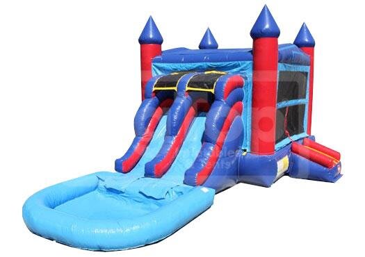 The FunHouse 2 lane water combo is a multi functional unit with jump area, 2 slides, basketball hoop, blow-up tubes and an option for water sprinkler.